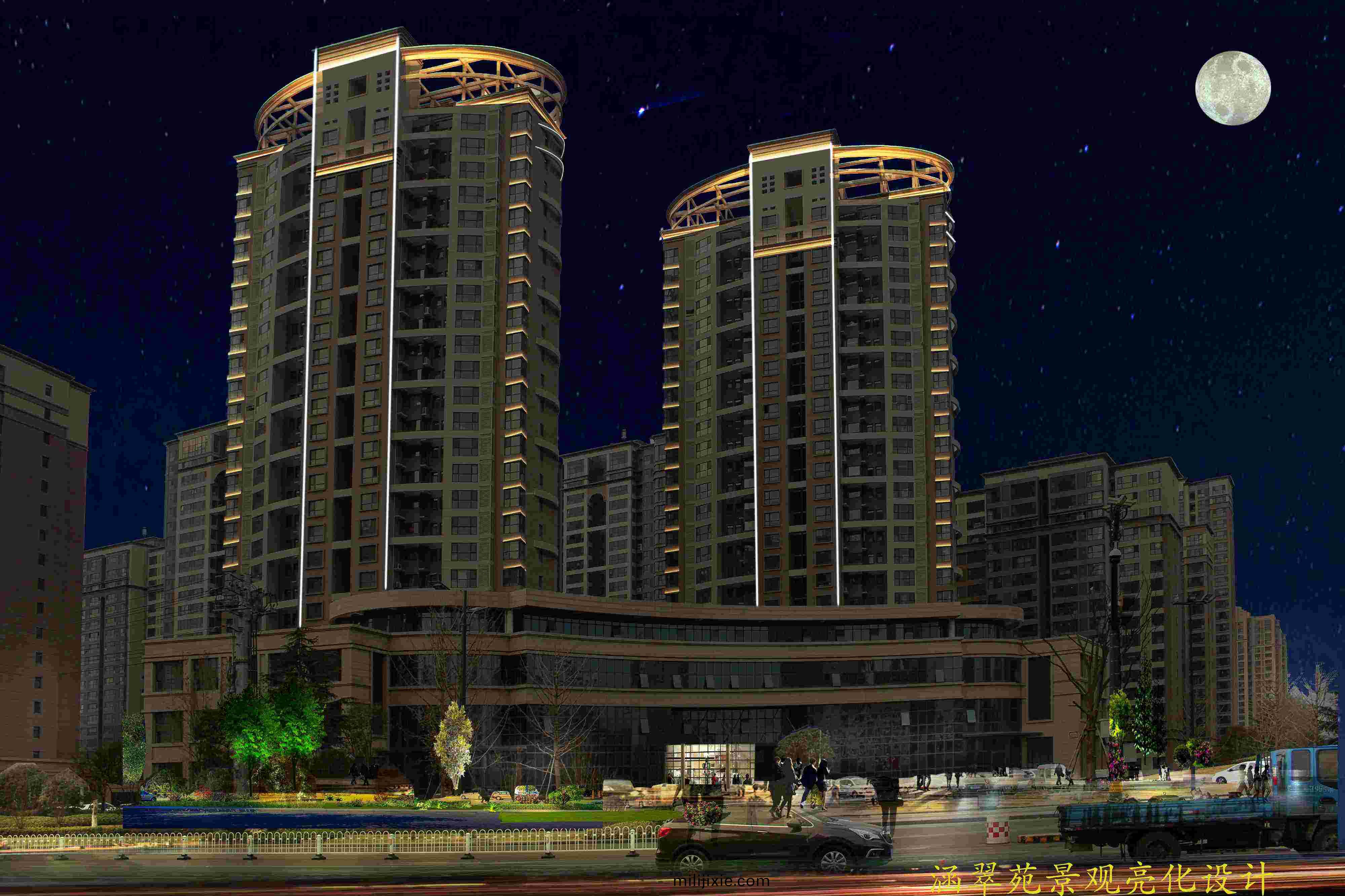整體風格簡潔、大方,光色上以黃光爲(wei)主,煗白色爲輔,線條簡潔(jie)明了,突齣建築物整體佈跼結構。